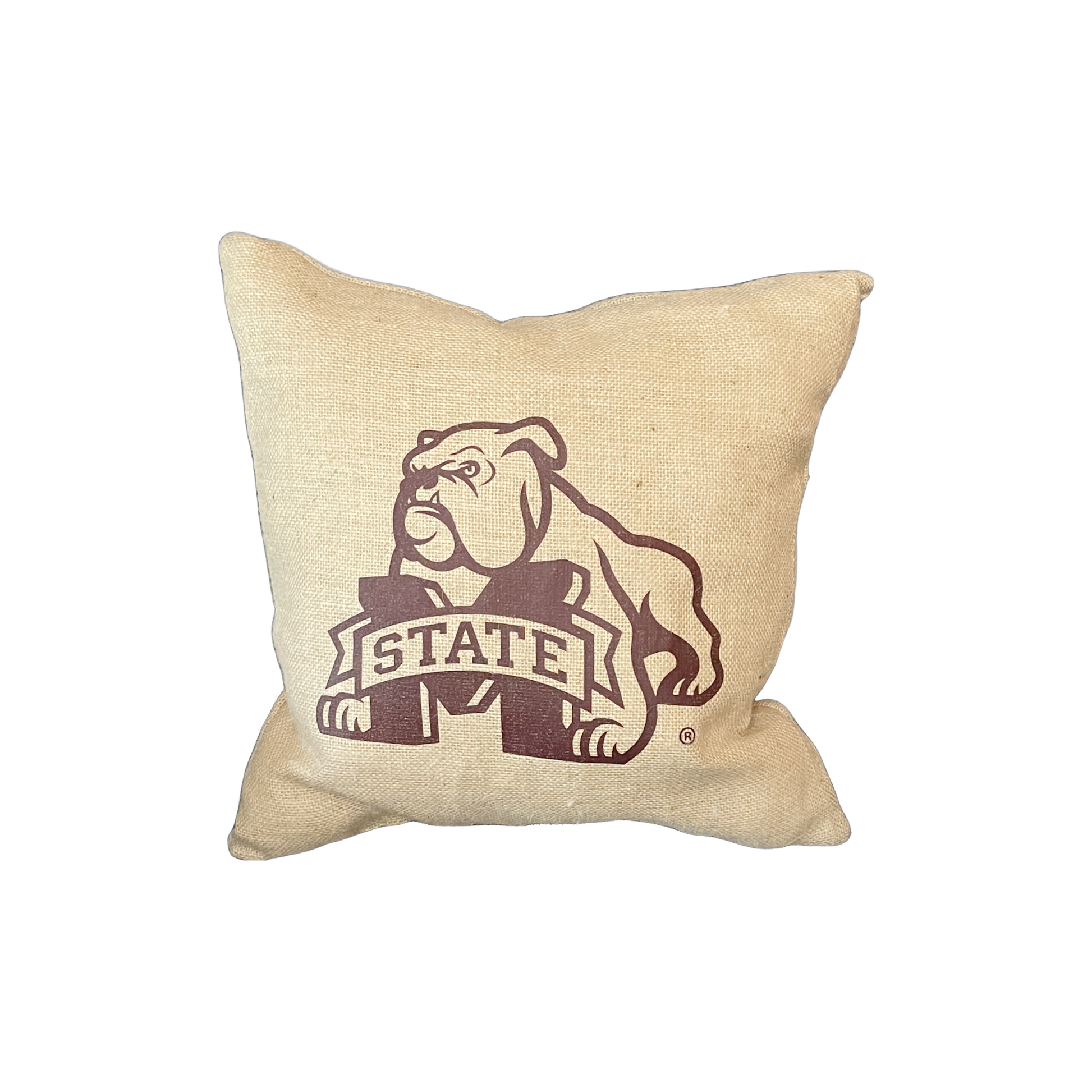 18"x18" square burlap pillow printed with licensed MState Bully logo.